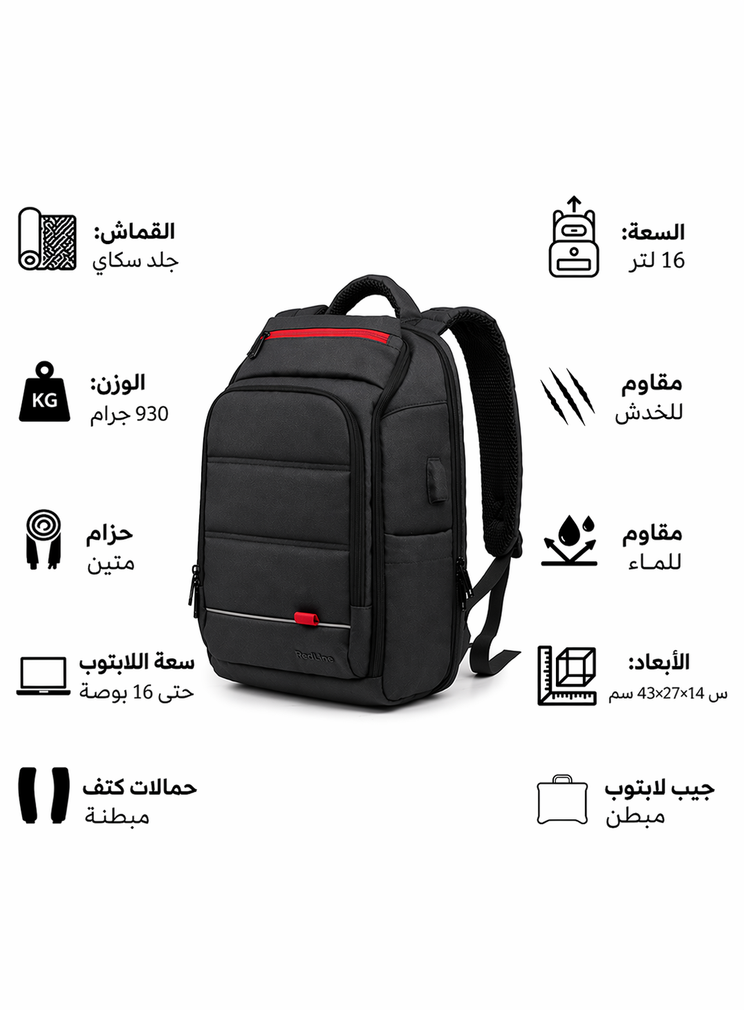- جيب الأجهزة (فتح 360°): مكان مبطن للاب توب (حتى 16 انش) + حزام أمان + جيب تابلت