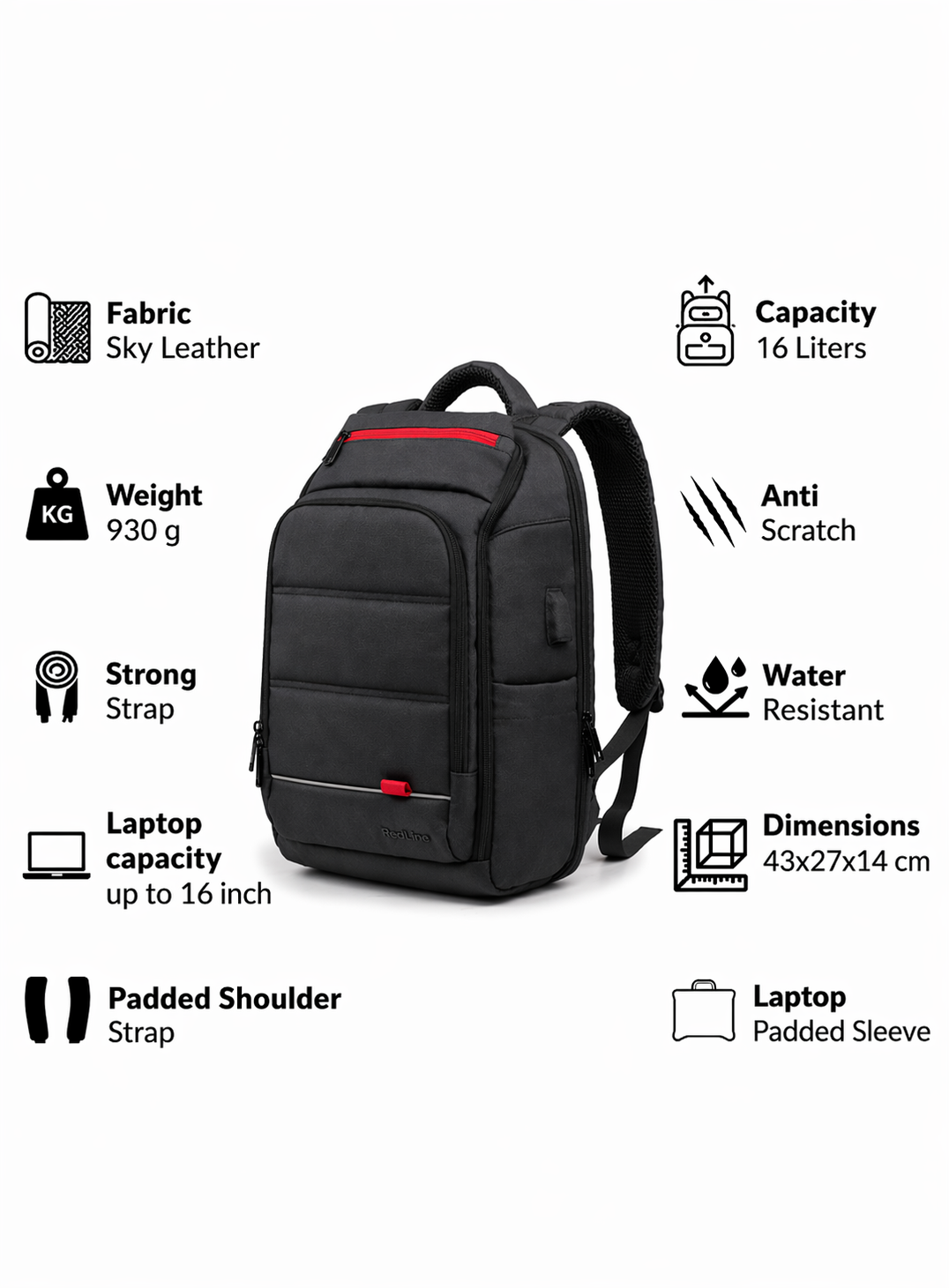 - Tech Compartment (360° Opening): Padded laptop sleeve (up to 16 inch) + safety strap + tablet pocket