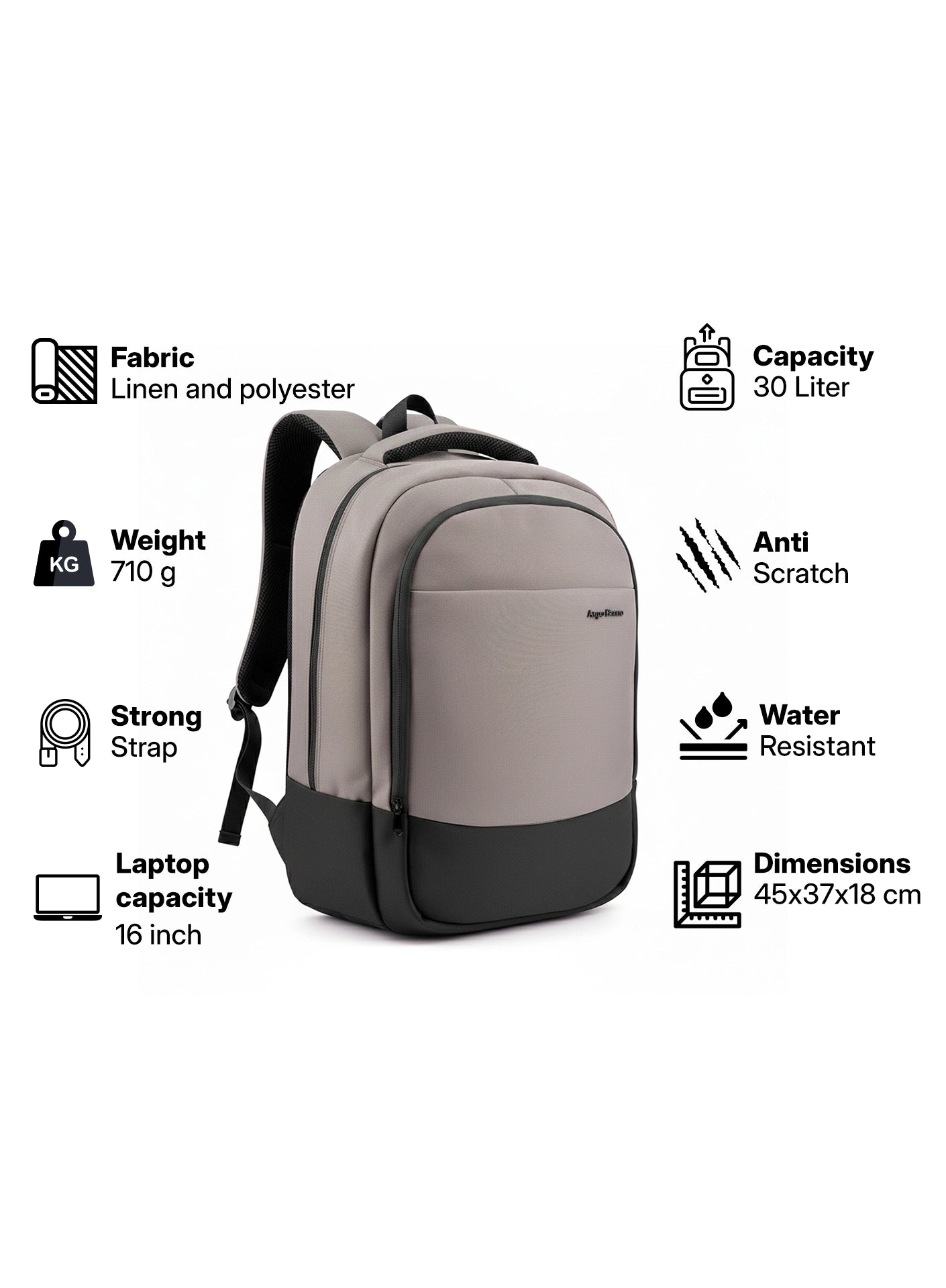 The XL Backpack is designed for modern everyday use, combining style, durability, and comfort in a lightweight build. Made from a premium linen and polyester fabric, it features a 30 liter capacity with smart organization and a dedicated padded compartment that fits up to a 16-inch laptop. Weighing only 710 g, it’s easy to carry all day, while the strong shoulder straps ensure lasting comfort and support. The backpack’s anti-scratch exterior helps maintain a clean, professional look, and its water-resistant finish protects your essentials from light rain and spills.